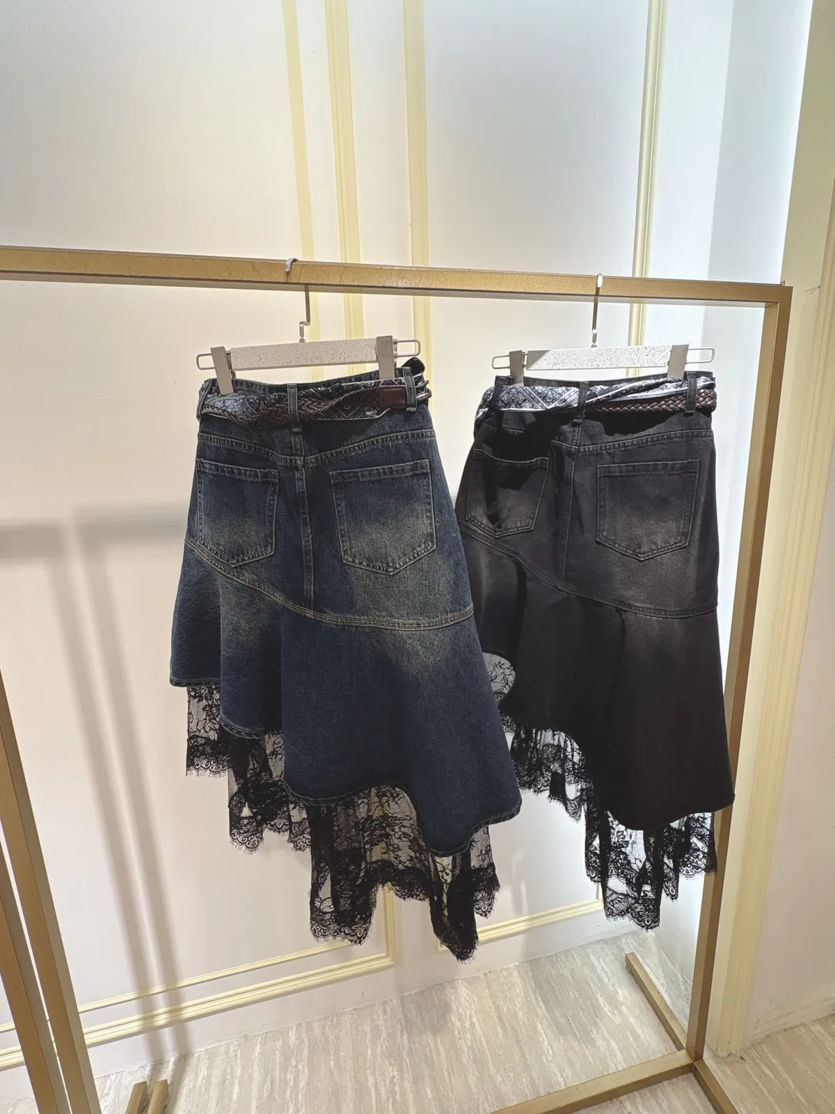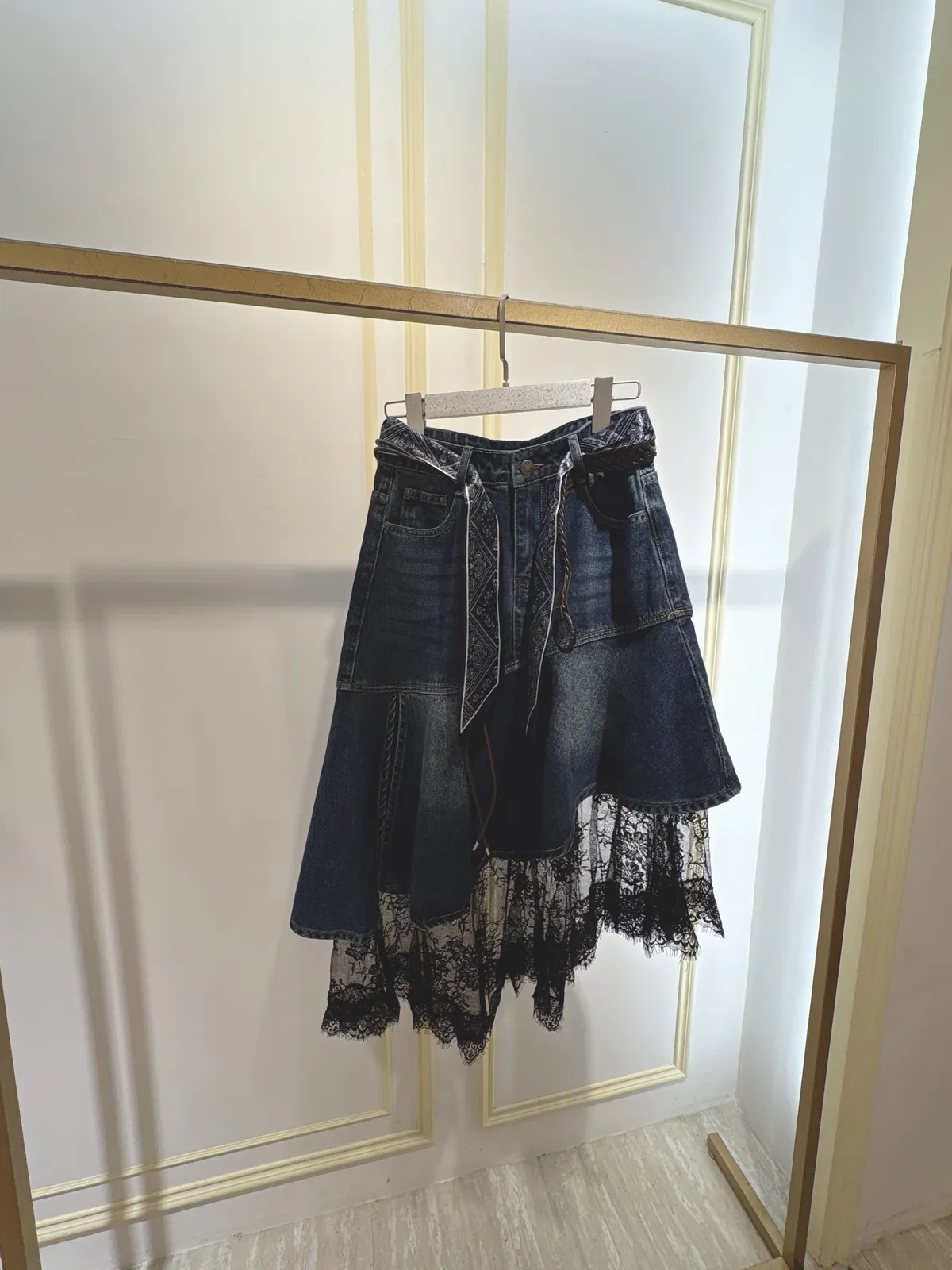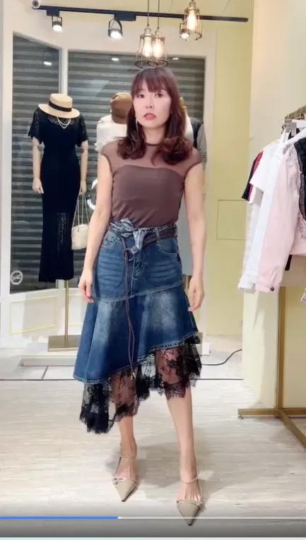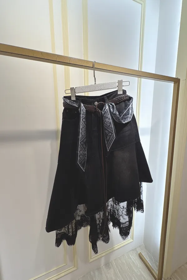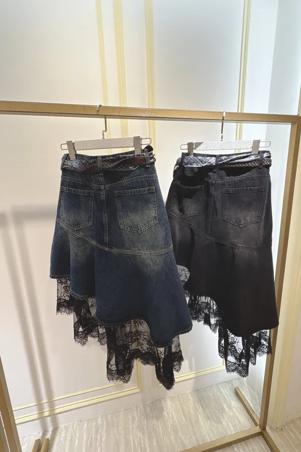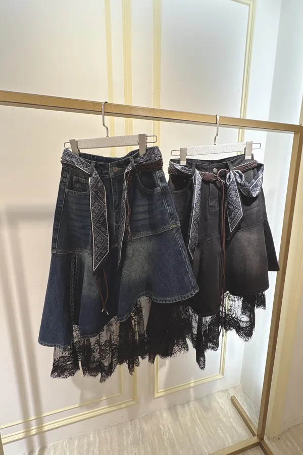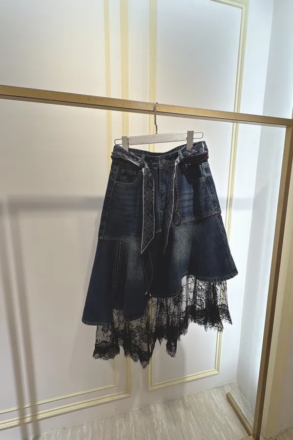 S061牛仔斜切蕾絲蛋糕裙